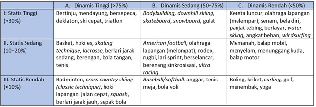 Tabel 1. Klasifikasi Olahraga Berdasarkan Komponen Statis Puncak dan Dinamis Puncak