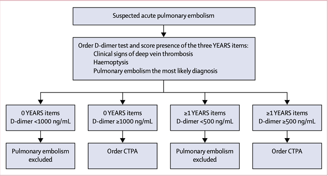 Algoritma ini pada awalnya dapat menyingkirkan pemeriksaan maupun kecurigaan emboli paru pada 85% pasien tanpa adanya riwayat pemberian antikoagulan oral dalam 24 jam sebelum timbul gejala klinis. Di dalam algoritma YEARS, ditekankan bahwa salah satu komponen YEARS dengan D-dimer ≤500 ng/mL dapat mengurangi pemeriksaan CTPA sebesar 48%.[9]