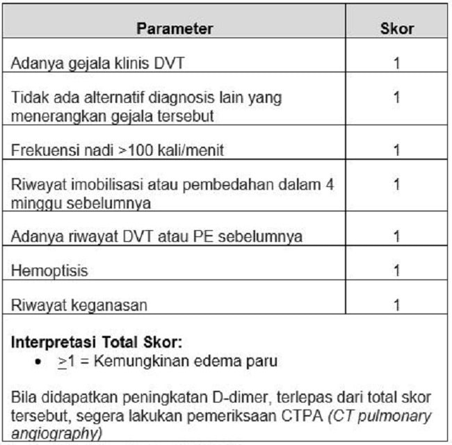 Penggunaan sistem skoring pada emboli paru merupakan pemeriksaan alternatif yang lebih aman dan memiliki akurasi yang baik dalam diagnosis emboli paru. Diagnosis pasti emboli paru ditegakkan dengan pemeriksaan radiologi, tetapi sistem skoring dapat membantu mengidentifikasi pasien di instalasi gawat darurat (IGD). Artikel ini akan fokus membahas sistem skor Wells dan YEARS.[1,2]
