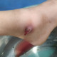 Dari foto kaki pasien ini, lebih mengkhawatirkan bentuk luka pada malleolus lateral. Apakah ini hanya abrasi kulit atau apakah luka tersebut berhubungan dengan sendi/tulang yang menonjol. Berdasarkan Ottawa rules, jika terdapat bengkak dan luka pada maleolus lateral, walau hanya dangkal, maka harus dirujuk untuk rontgen.