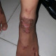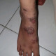 O/ ukk: pada punggung kaki kanan, punggung kaki kanan, tampak lesi plak hiperpigmentasi dengan krusta cokelat kekuningan, dasar eritem, berbatas tegas dan bentuknya iregular.