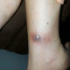Alo dokter, saya menemukan pasien ny X usia 66 tahun dengan keluhan 2 lesi kemerahan di kaki sejak 2 minggu yll. Kemerahan muncul tiba-tiba, tidak terasa nyeri ataupun gatal sama sekali. Di tengahnya terdapat lesi kecoklatan berisi cairan seperti nanah (yang 1 sudah pecah dan menghitam). Tidak ada keluhan lain. Riwayat digigit serangga tidak ada. Riwayat sebelumnya pernah mengalami lesi yang sama 1x tanpa diobati di kaki sebelahnya, sudah sembuh sempurna. Riwayat konsumsi obat -. Riwayat penyakit lain -.