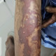 Alo dokter, izin minta pendapat sy memperoleh pasien laki-laki usia 72 tahun, dtg dengan keluhan kulit pada paha kanan yg nampak seperti digambar, ukk ruam merah kecoklatan dengan tepi lebih gelap, tidak gatal, tidak ada skuama, bentuk seperi pulau, saat diraba seperti tekstur luka bakar,tidak peninggian kulit, terasa agak perih walaupun tanpa penekanan, awalnya keluhan muncul ruam kemerahan yg kemudian melebar dan menjadi seperti inu, keluhan ini muncul tiba2 dan meluas sekitar 3 hari. Terdapat keluhan serupa pada skrotum disertai beberapa bagian kulit yg melepuh dan terkelupas ( mohon maaf yg bagian skrotum tidak sempat di foto). Aktivitas pasien sebelum muncul keluhan kulit : petani kerja menyemprot rumput dgn obat-obatan herbisida yg telah biasa digunakan pasien. RPD :- Mungkin ada dokter-dokter yg pernah dapat kasus serupa atau mengetahui apa kemungkinan kelainan kulit pasien ini?