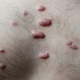 Berikut foto dari lesi keloid, letaknya ada di dada, multilpel, namun ukuran masih kecil-sedang bervariasi antara 0,5 cm x 0,5 cm sampai 0,5 cm x 1 cm. Untuk ukuran keloid seperti ini lebih efektif memakai Triamcinolone topikal, plester/gel, atau langsung suntikan saja ya?