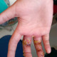 S: Pasien datang dengan Keluhan muncul koreng/ruam pada tangan kanan sejak 1 minggu yang lalu, keluhan dirasakan gatal setiap saat. Awalnya hanya satu jari yg terkena, karna digaruk kemudian menyebar ke jari sebelahnya. Keluhan disertai denngan demam ringan sejak kemarin. Di teman dekat yang mengalami hal yang serupa.
