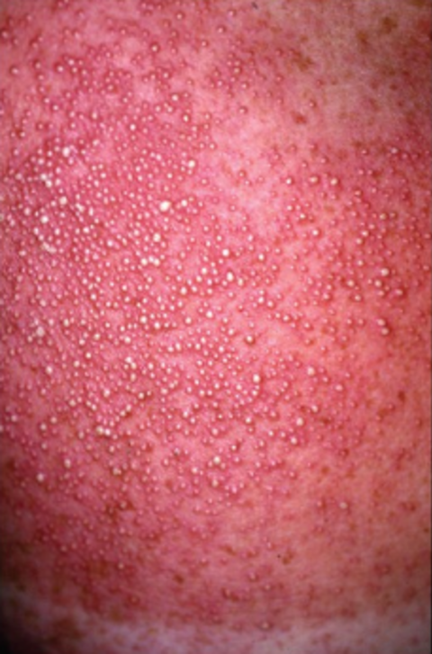 3 hari setelah dapat MP dan cetirizine serta salep, pasien datang ke saya dengan keluhan lesi2 tsb makin luas, hanya yang di leher saja yang dirasa mendingan. Status lokalisnya nampak lesi2 pustular ukuran milier, dengan dasar eritema terutama di torso (apalagi di payudara dan inframammae, serta di inguinal), lengan kecuali telapak, paha, lalu kalau di cruris hanya seceplok2 tidak generalisata seperti di tempat lain. Yang di leher menurut pasien awalnya spt itu juga tapi sejak dioles betametason - neomisin salep, sudah mendingan katanya - gambarannya jadi kulit eritema dengan deskuamasi. sudah tak tampak lesi pustular lagi. Sama sekali tidak ada keterlibatan mukosa mulut, hidung maupun vagina