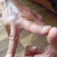 Selang 2 Minggu kemudian, ruam makin melebar hingga ke tangan dengan bentuk Lesi Papul kemerahan seperti pada gambar