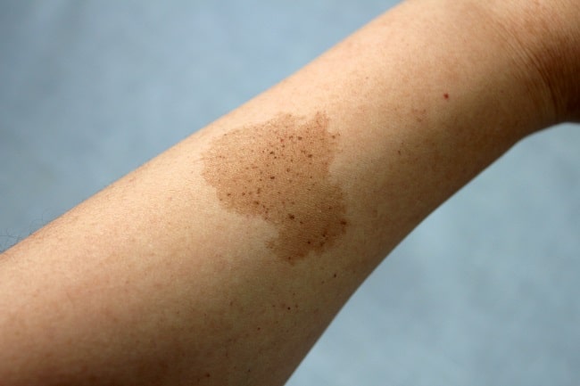 Kelainan ini ditandai dengan makula atau patch hiperpigmentasi berbatas tegas dengan ukuran 1-2 mm hingga diameter terbesar 20 cm. Pada individu berkulit terang warnanya akan terlihat coklat terang atau seperti coklat susu, sedangkan pada individu berkulit gelap akan terlihat berwarna coklat gelap.[3,4]