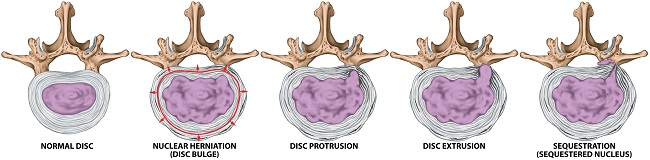 Bulging adalah tonjolan diskus >25% diameter diskus intervertebralis. Protrusi adalah gambaran di mana diskus yang menonjol lebih sempit daripada leher tonjolannya. Ekstrusi dinyatakan bila bagian yang menonjol lebih lebar daripada lehernya. Sekuestrasi adalah subtipe ekstrusi, di mana bagian yang herniasi/menonjol hubungannya lepas dengan diskus intervertebra.[10,18]