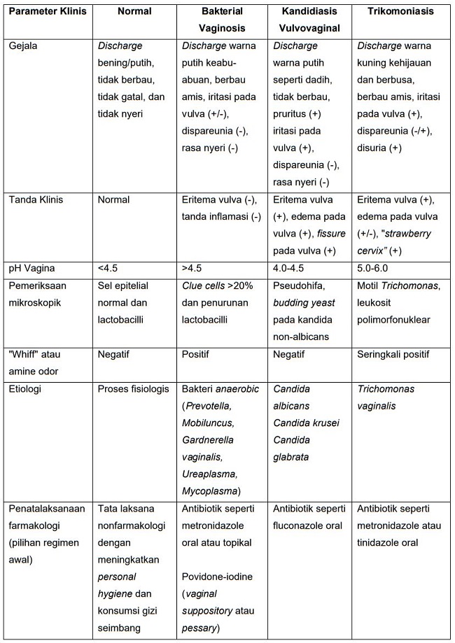 Vaginal discharge yang abnormal dapat disertai dengan rasa gatal (pruritus) dan iritasi pada vulva yang mengindikasikan adanya infeksi pada vulva dan vagina. Terdapat tiga penyebab utama infeksi yang menyebabkan terjadinya vaginal discharge yang abnormal yaitu bakterial vaginosis, kandidiasis, dan trikomoniasis.[4-6]