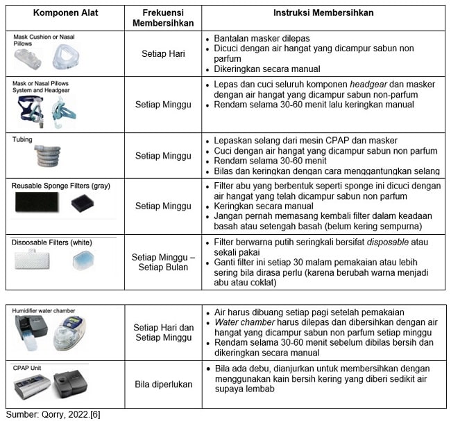 Secara umum, perawatan komponen CPAP yang perlu dilakukan setiap hari adalah membersihkan water chamber untuk humidifier serta bantalan masker dan nasal kanul. Sementara perawatan komponen CPAP yang perlu dilakukan seminggu sekali adalah mencuci masker atau nasal kanul, headgear, selang (tubing), serta filter abu-abu.