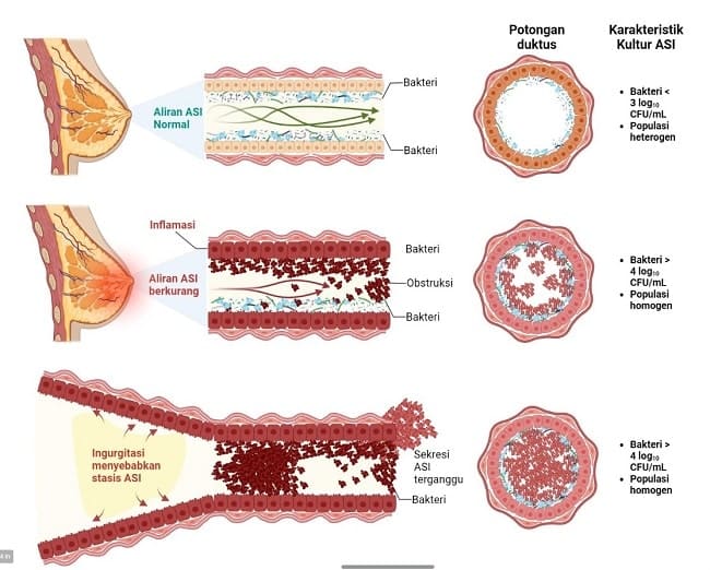 Studi-studi terbaru mengisyaratkan adanya peran disbiosis dalam patofisiologi mastitis laktasi. Istilah disbiosis umumnya dipakai untuk menggambarkan ketidakseimbangan komposisi bakteri, perubahan aktivitas metabolik bakteri, atau perubahan distribusi bakteri di dalam usus. Namun, disbiosis juga kini digunakan untuk menggambarkan perubahan keseimbangan populasi atau aktivitas mikroba di dalam ASI (Gambar 1).[1,2]