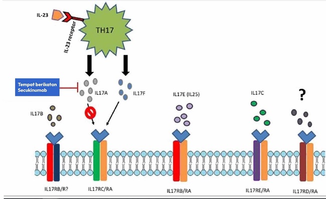 Secukinumab menghambat IL-17A dan mencegahnya berikatan dengan reseptornya.[2]