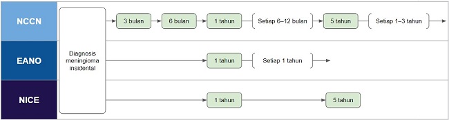 National Comprehensive Cancer Network (NCCN), European Association of Neuro-Oncology (EANO), dan National Institute for Health and Care Excellence (NICE) membuat rekomendasi durasi pemantauan aktif pada pasien meningioma insidental yang dapat dilihat pada gambar 1.[2]