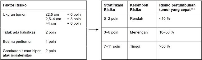 Temuan MRI berupa hiperintensitas pada MRI T2-WI, volume >10 cm3 dan edema peritumoral menunjukkan meningioma yang berisiko tinggi. Pada pasien yang berisiko tinggi tersebut, dapat dipertimbangkan intervensi dini berupa pembedahan atau radioterapi stereotaktik.