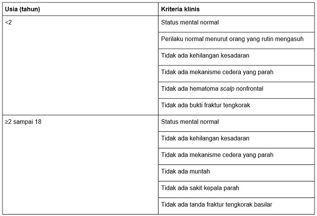 Tabel 1. Kriteria PECARN untuk Anak yang Berisiko Sangat Rendah Mengalami Cedera Otak Traumatik Signifikan
