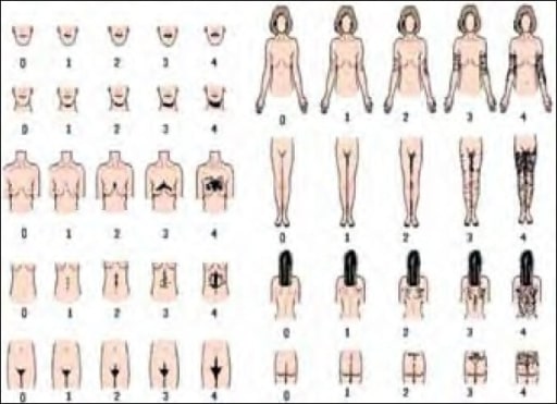 Derajat keparahan hirsutism dapat dievaluasi melalui sistem skor Ferriman-Gallwey yang menilai densitas rambut pada beberapa area tubuh. Pasien dengan kondisi hirsutism juga umumnya memiliki beberapa gejala yang berkaitan dengan hiperandrogen seperti siklus menstruasi yang tidak teratur, alopesia frontalis, dan jerawat.[1,2,8]