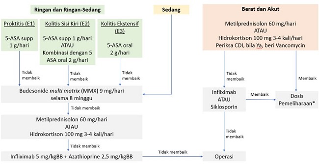 Penting juga untuk dilakukan pemeriksaan infeksi Clostridium difficile, bila positif maka disarankan untuk memberikan antibiotik vancomycin. Bila masih tidak berhasil dengan terapi kortikosteroid, maka disarankan pemberian infliximab atau siklosporin. Bila terjadi perbaikan, maka dilanjutkan dengan dosis rumatan/pemeliharaan.
