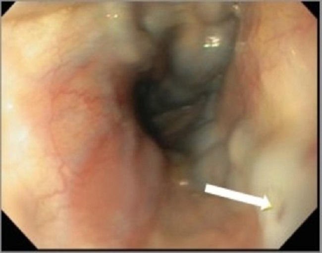 Gambar 2. Red Wale Sign pada Varises Esofagus yang Ditunjukkan pada Tanda Panah Putih. Sumber: Openi, 2016.