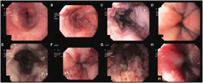 Pemeriksaan EGD juga dapat membantu menentukan grading varises esofagus yang ditunjukkan pada gambar di bawah ini. Grade 1 menunjukkan varises esofagus yang kecil (gambar A). Grade 2 menunjukkan gambaran varises esofagus yang kecil dan membentuk seperti manik–manik (gambar B).[22]
