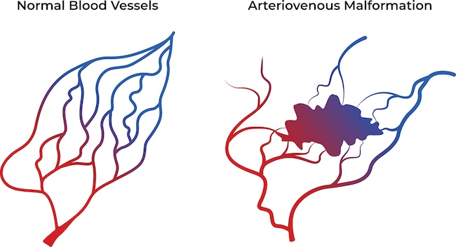 Tidak adanya pembuluh kapiler pada AVM menyebabkan aliran darah arteri ke vena tinggi dengan resistensi rendah. Tekanan hidrostatik arteri yang tinggi menyebabkan dinding vena dapat terdisrupsi terus menerus yang berakibat terjadinya perdarahan. Perdarahan fatal dapat terjadi secara akut dan masif.[1,3,4]