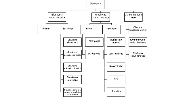 Jenis glaukoma yang paling banyak ditemukan pada praktik klinis adalah glaukoma sudut terbuka. Tetapi, glaukoma juga bisa terjadi dengan sudut tertutup atau glaukoma tanpa peningkatan tekanan intraokular (normotensi). Klasifikasi glaukoma selengkapnya dapat dilihat dalam bagan di bawah ini.[5]