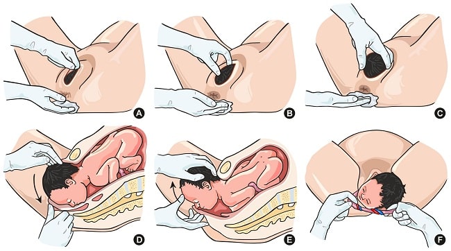 - Jaga perineum dengan cara menekannya menggunakan satu tangan yang dilapisi dengan kain kering dan bersih